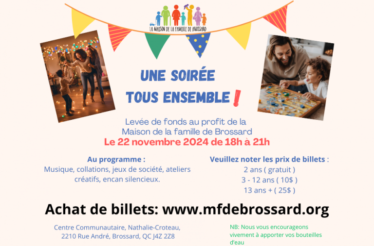 Une soirée tous ensemble : Pour la Maison de la famille de Brossard Venez partager un moment convivial et chaleureux lors de notre événement « Une Soirée Tous Ensemble » ! Joignez-vous à nous pour une soirée mémorable au profit de la Maison de la Famille de Brossard, qui soutient les familles de …