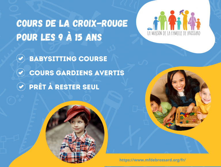 Ce sont des cours organisés par MEB Formations, partenaire de la Croix-Rouge Canadienne. Ce cours permet aux jeunes d’acquérir les connaissances afin d’apprendre à se garder seuls à la maison et/ou d’acquérir les connaissances afin de devenir des gardiens d’enfants compétents. Pour en savoir davantage, cliquez ici