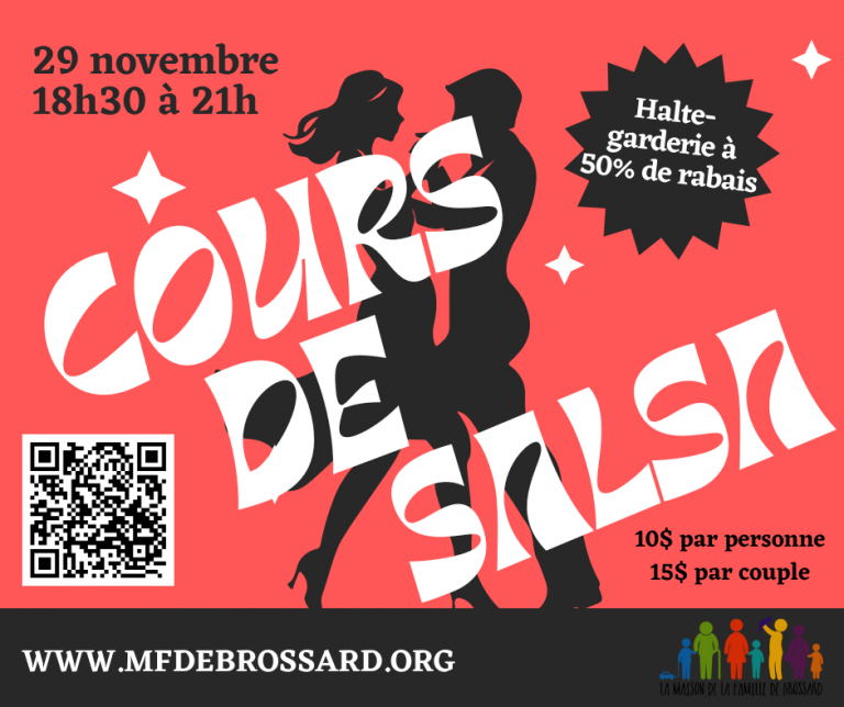 Rejoignez-nous pour une soirée inoubliable et solidaire ! Venez participer à notre événement COURS DE DANSE SALSA et profitez d’une ambiance conviviale et dynamique ! Entrée : 10 $ par personne, 15 $ le couple 50% de rabais sur le vendredi de répit pour vos tout-petits (halte-garderie pour les 2 à 12 ans) …